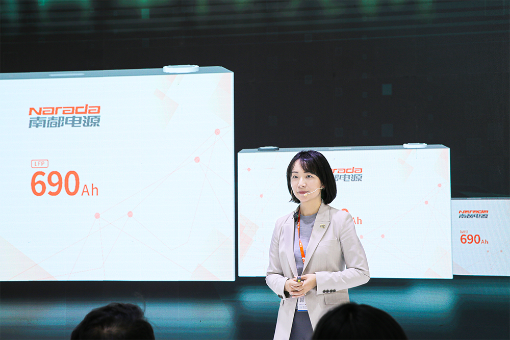 Dr. Jiayuan Xiang, Vice President and Chief Engineer of Narada, unveiled the 690Ah ultra-large capacity energy storage battery at the exhibition booth.